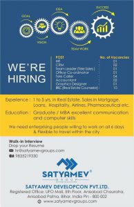 अगर आप भी रियल एस्‍टेट कारोबार से जुड़ना चाहते हैं तो आपके लिए सुनहरा मौका है. पटना की रियल एस्‍टेट कंपनी सत्यमेव ग्रुप  ने कई पदों पर वैकेंसी निकाली है. अच्‍छी बात ये है कि ओपनिंग्‍स पटना के लिए हैं.कंपनी के मैनेजिंग डायरेक्टर रंजीत कुमार सिंह ने बताया कि सत्यमेव डेवेलपकॉन बिहार के युवाओं को मौक़ा देना चाहती है , जिससे कि बिहार से बाहर जो काम करते हैं या करने जाने को इच्छुक हैं, उन्हें अपने राज्य में ही भविष्य संवारने का मौक़ा मिल  सके !