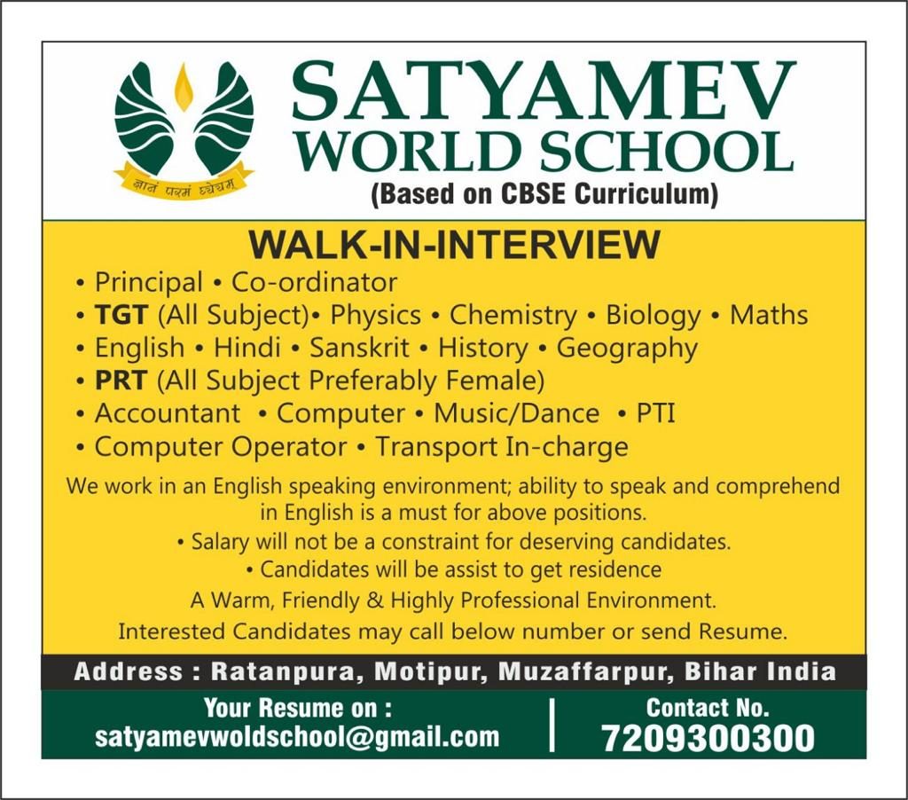 सत्यमेव वर्ल्ड स्कूल, रतनपुरा मुजफ्फरपुर ने बिभिन्न पदों पर भर्ती के लिए आवेदन आमंत्रित किए हैं. इन पदों के लिए इच्छुक और योग्य उम्मीदवार 22 अप्रैल , 2019 तक आवेदन कर सकते हैं.