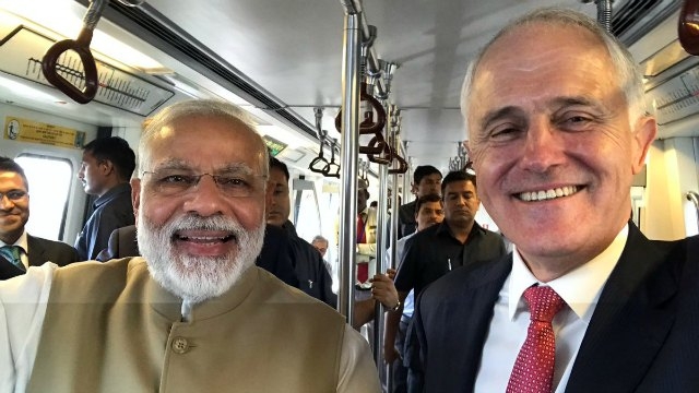 PM नरेंद्र मोदी ऑस्ट्रेलियाई पीएम मैल्कम टर्नबुल के साथ सोमवार को अचानक दिल्ली के मंडी मेट्रो स्टेशन पहुंच गए. दोनों देशों के पीएम मंडी हाउस मेट्रो स्टेशन पर कुछ वक्त बिताने के बाद मेट्रो पर सवार हो गए और अक्षरधाम पहुंच गए. सफर के दौरान दोनों पीएम आपस में बातचीत कर दिखे.
