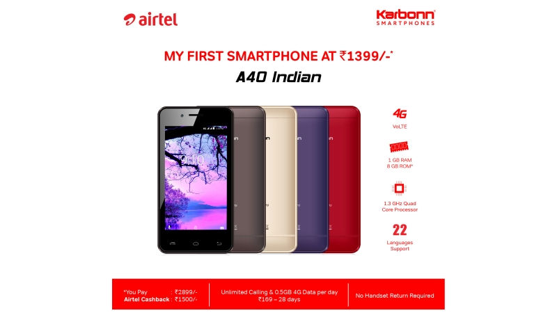 एयरटेल कार्बन ए40 स्मार्टफोन मात्र 1399 रुपए में मुहैया कराएगा, इसकी मार्केट में फिलहाल 3,499 रुपए कीमत है। गूगल से मान्यताप्राप्त यह फोन पूरी तरह से टच टेक्नोलॉजी पर काम करता है। इसमें डुअल सिम का ऑप्शन है और गूगल प्ले स्टोर पर मौजूद सभी एप्लीकेशन को इसपर डाउनलोड किया जा सकता है। फोन पर फेसबुक, यूट्यूब, और व्हाट्सएप आसानी से चलेंगे। एयरटेल के मुताबिक फोन के लिए 1399 रुपए की कीमत के अलावा 169 रुपए का मासिक पैक जरूरी है।